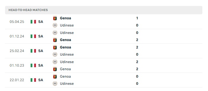 - Kèo tỷ số H2 Udinese vs Genoa: 2-1