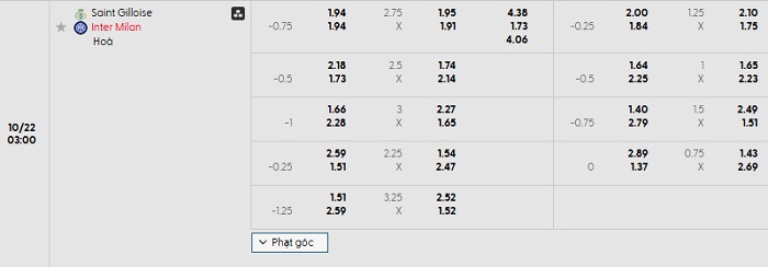 Bảng tỷ lệ kèo bóng đá Union Saint-Gilloise vs Inter Milan