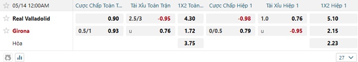 Bảng tỷ lệ kèo nhà cái Valladolid vs Girona