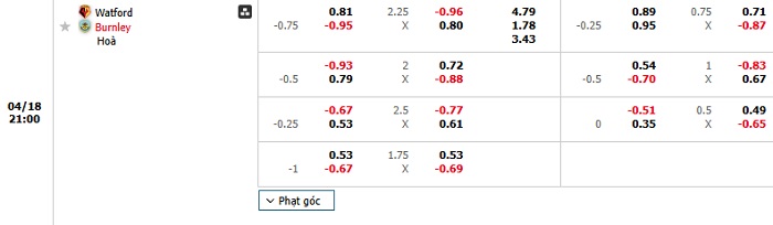 Bảng kèo bóng đá Watford vs Burnley