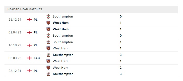 Lịch sử đối đầu West Ham Utd vs Southampton