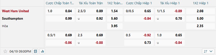- Kèo tỷ số H1 West Ham Utd vs Southampton: 1-0