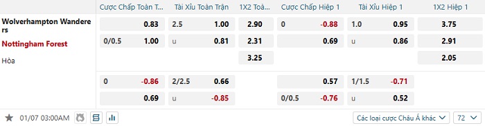 Bảng tỷ lệ kèo bóng đá Wolves vs Nottingham Forest